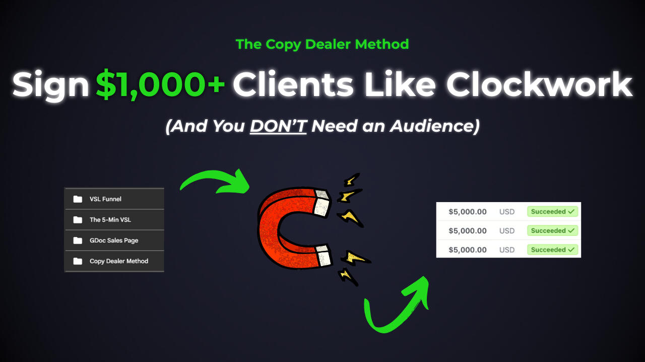 It seems like everyone (+ their grandma) are making money online rn.Well, everyone except you…I know it sucks.The truth?These people aren’t any smarter than you.Or more talented.Or more creative.And you’ve probably watched tons of YouTube videos already.Maybe bought one of those guru courses.Still crickets.Meanwhile, you see 19y/o's post these crazy Stripe screenshots.So the $1M question is:"What do THEY have that YOU don't??"Simple.A REAL CLIENT ACQUISITION SYSTEM.You see, if you wanna make money online in 2026...Then you need to stop using outdated 2019-ish tactics.Spamming 1000s of emails and DM's ain't cut it anymore...What actually works today?1. A Godfather offer (so good it makes saying no feel dumb).2. A plug & play prospecting strategy that positions you as an authority so prospects reach out to you.NOT posting more content.NOT buying another course.NOT trying advice that works for people 1000 steps ahead of you.A system that allows you to sign high-paying clients, consistently and predictably w/o having a big audience online.Now, let me be 100% real with you...Back in 2019, I quit my job to build a coaching biz.And it worked… until it didn’t.Four years later, I went broke... $12k in debt, stuck in a soul sucking cold calling job – 200 calls a day, chasing quotas for someone else’s dream...My only goal:Get outta here ASAP + get back my freedom.So I was binging YouTube videos like a madman.Listening to the online gurus.Trying content, DM's, cold email.But didn't make ONE single $...Until I discovered the simplest way to make money online – selling Google doc offers that solve high-demand problems for businesses.And finally landed my first client ($1,200).Fast forward 7 months of landing clients consistently, I quit my job to go full-time.Now, that didn't happen overnight...It took me months of trial & error figuring out what all those online gurus are hiding behind paywalls...And after sending 1000s of emails getting ghosted, I finally cracked the code to make strangers reach out to ME.I call it:The Copy Dealer Method.Today, I share with you what I wish someone gave me back when I started.My exact step-by-step system to sign high-paying clients.So, are you ready to finally getting paid?